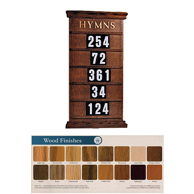 Oak without stand for wall mounting, 19" wide by 34" height. Includes 3 sets of numbers and 1 set of letters.