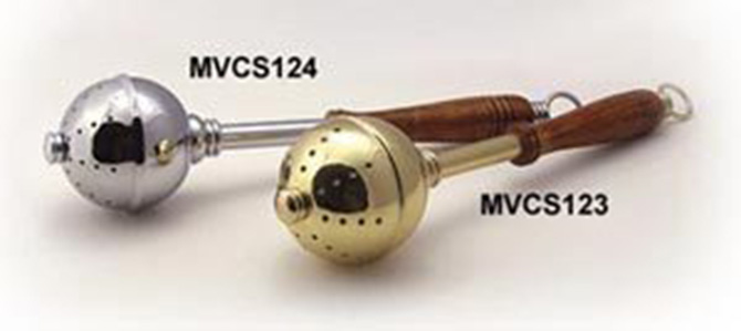 Polished and lacquered solid brass sprinkler with a wooden handle, 11-1/2" long.