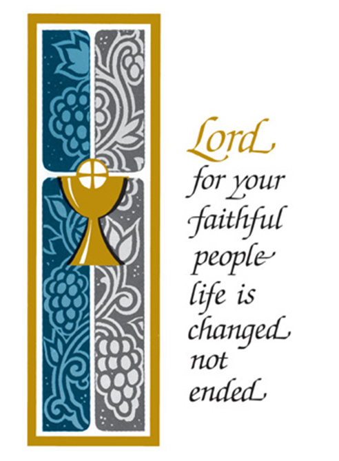"Lord for your faithful people life is changed not ended" text on the front. Inside Verse Reads :: "The Holy Sacrifice of the Mass will be offered for the repose of the soul of ___________________". 100 per box. 4-1/2" x 6-1/8"