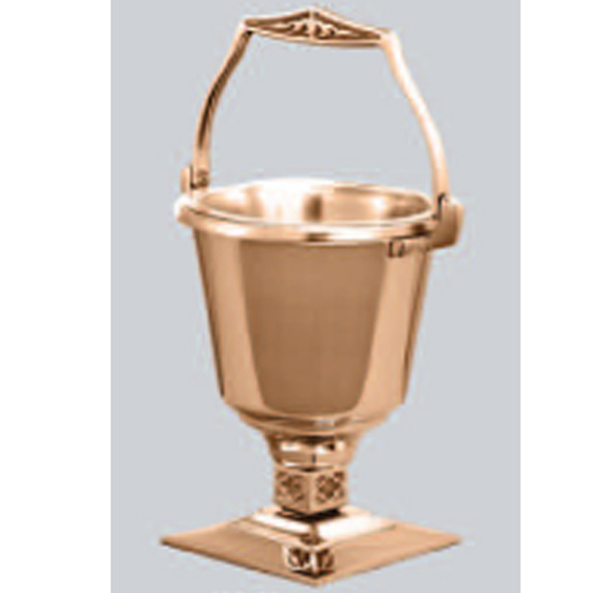 Holy Water pot and sprinkler, made of bronze in a high polish finish. Includes a removable clear plastic liner. Brass available for additional 10% cost.