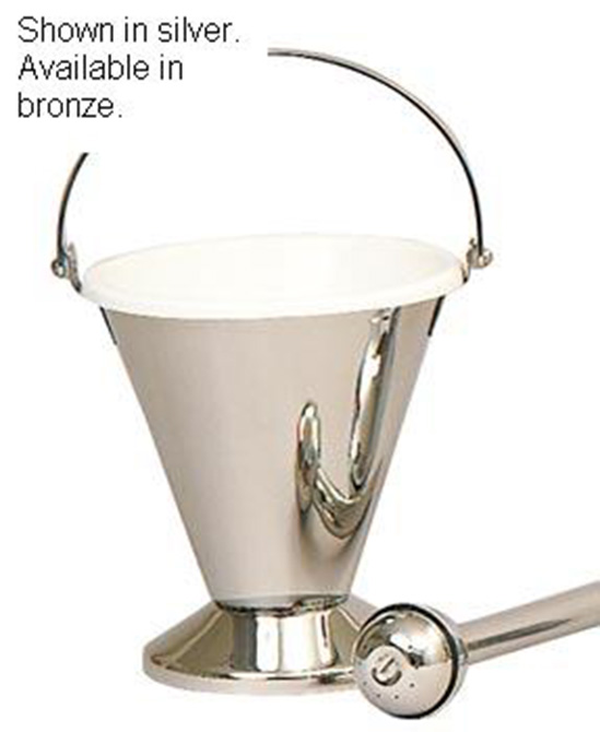 Holy Water Pot with Sprinkler and Liner. Holy water pot 7 inch high x 6-1/2 inch diameter, satin bronze finish. Sprinkler 9-3/4 inch long.