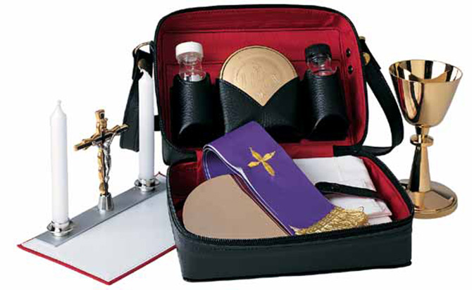 Mass Kit. 7-1/2 inch x 5-1/2 inch x 3-1/2 inch leather case, 5-1/4 inch high chalice, cup (3 ounce cap), 3-7/8 inch diameter paten, 3-1/8 inch diameter host box (40 host capacity), 1 ounce cruets, 4 inch high crucifix, 58 inch x 2 inch stole, two candles, altar, hand & finger cloths.