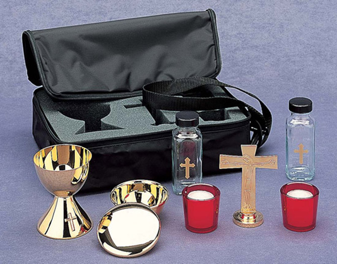 Complete set includes 4-1/2" chalice/ciborium, host box cap. 50, 4-3/8" crucifix, candles/holders 2" high, cruets w/etched cross 4 ounce Soft vinyl case measures 12-1/2" x 10" x 3".