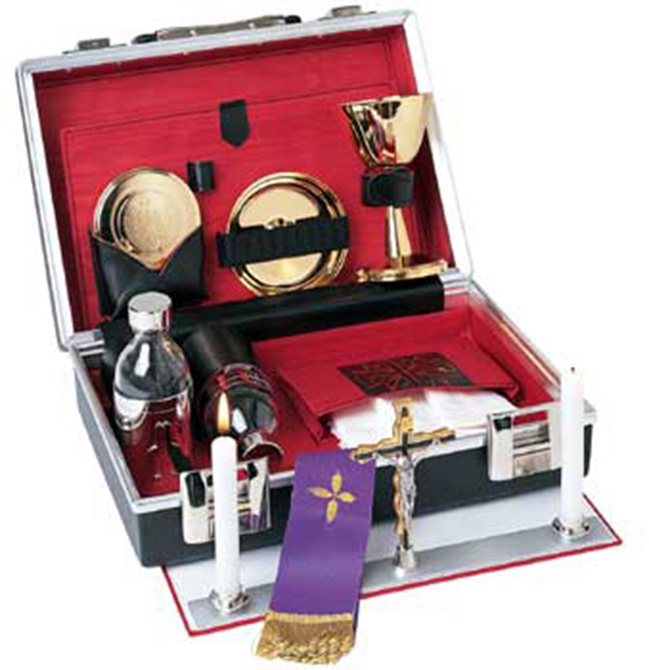Mass Kit. 12-1/2 inch x 9-1/2 inch x 4 inch durable, secure case, 5-1/4 inch high chalice (5 ounce capacity), 3-3/4 inch diameter bowl paten, 3 inch diameter host box (40 host capacity), 4-1/2 ounce cruets, 4-3/4 inch high crucifix, 58 inch x 2 inch stole, four candles, altar, hand & finger cloths.