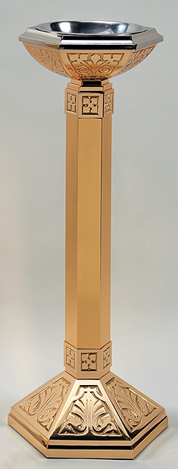 Standing Holy Water Font, made of bronze in satin finish. Stainless steel basin (9" diameter by 2-1/2" deep) is removable. Overall height 36". Base measures 12" x 14".