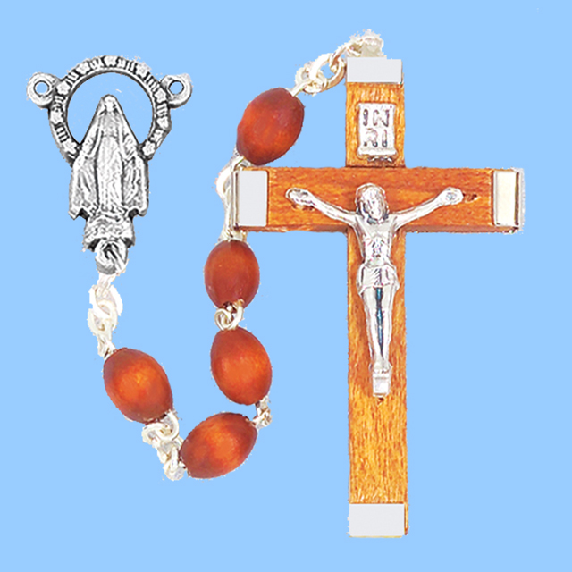 Brown polished oval boxwood beads with silver oxidized center and wood crucifix. 7 x 9 mm beads, 17-1/2 inches overall length.