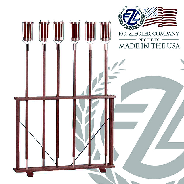 Processional Torch Style 3956 - STAND ONLY - Made from Oak wood, 27" inch Height, 37" Width. Holds 3 pairs of torches (6 pc). Shown with style ZZ898X Torches with Ruby Globes. Holes accommodate a 1" diameter processional shaft. Torches sold separately.