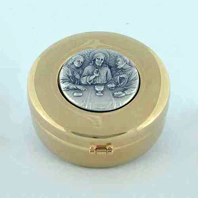 Hospital Pyx. 24 karat gold plated with oxidized silver medallion. Hinged cover. 3 inch diameter, 60 host capacity Use with burse K-3085.