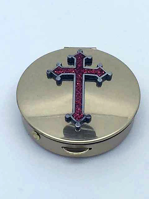 Gold finish 12 to 15 host capacity pyx with red cross symbol. 2-1/8" diameter, 0-1/2" high.