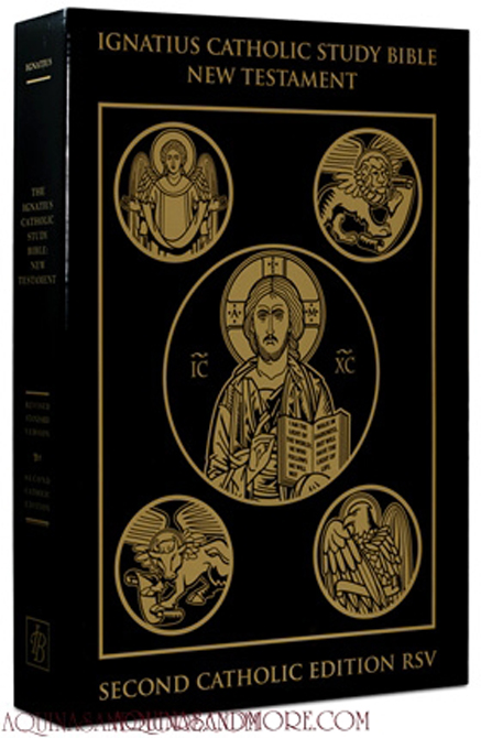 Ignatius Catholic Study Bible, RSV New Testament The only Catholic Study Bible based on the Revised Standard Version 2nd Catholic Edition, the Ignatius Catholic Study Bible New Testament brings together all of the books of the New Testament and the penetrating study tools developed by renowned Bible teachers Dr. Scott Hahn and Curtis Mitch. Also includes introduction to each book plus outline, extensive footnotes, topical essays & commentary; handy reference materials such as a doctrinal index, a concise concordance, a helpful cross-reference system, and various maps and charts. 726 pages. 7" x 10". Leather.