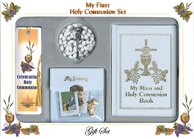 Girl's Communion set, complete with embossed textured cover book, rosary case, white rosary, bookmark, scapular and Communion pin. Gift boxed.