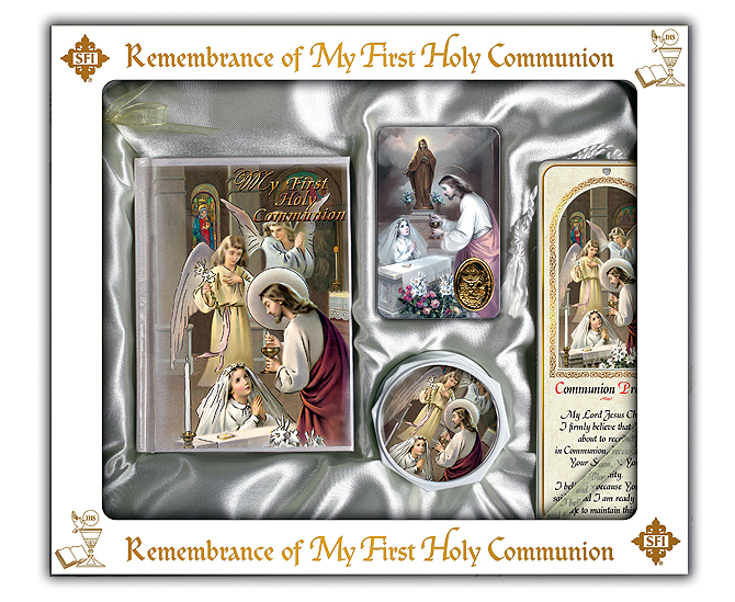 Gift Set includes First Communion Missal, Rosary with Rosary Case, Bookmark, Holy Card, Scapular and Lapel Pin. Attractively gift boxed.