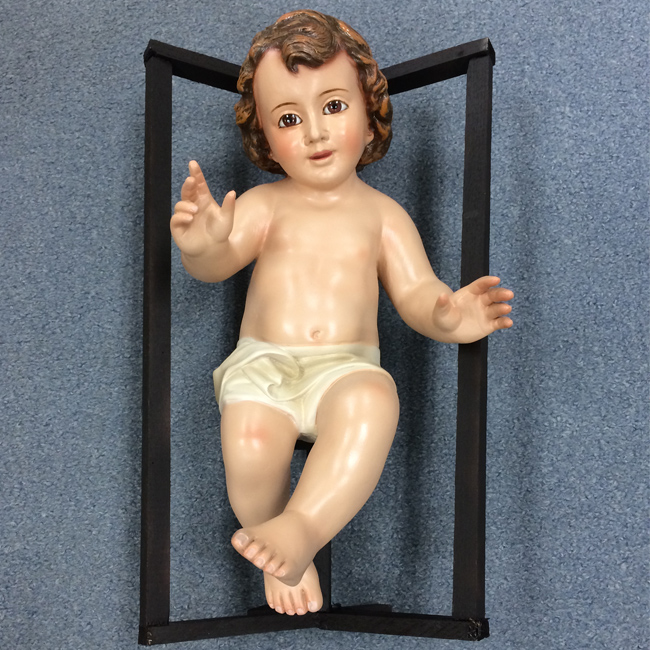 Hand painted imported infant made of plaster with glass eyes, includes crib.