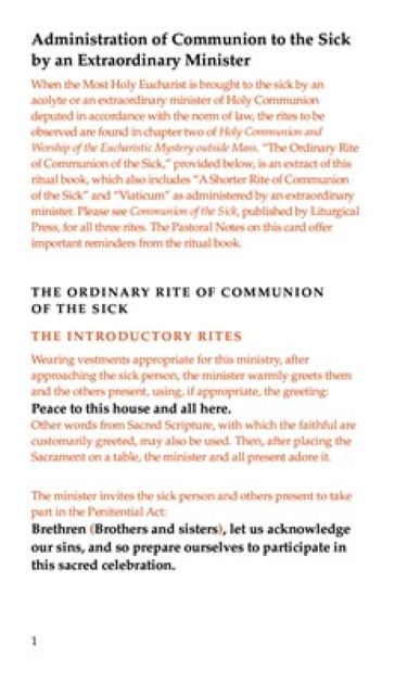 A portable liturgical card for extraordinary ministers of Holy Communion, newly revised with text from Holy Communion and Worship of the Eucharistic Mystery outside Mass, presented in an accessible format for ministers and printed in two colors on a heavy paper stock. Details: 8 pgs, 4 x 7