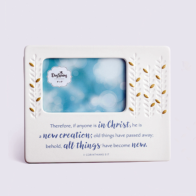 Celebrate new life in Christ and commemorate the baptism of a loved one with their photo displayed in this 'New Creation' Christian picture frame. Featured on this inspirational ceramic photo frame is a powerful Scripture from II Corinthians 5:17, along with a debossed leaf design splashed with embossed gold leaf accents. This inspirational photo frame makes a lovely keepsake - one that will be treasured for years to come. Message (NKJV Scripture text) Therefore, if anyone is in Christ, he is a new creation; old things have passed away; behold, all things have become new (II Corinthians 5:17). Full-scale size: 9-13/16 inches x 7-13/16 inches. Holds 6 inch x 4 inch photo. Made of ceramic and glass. Easel for desktop, tabletop, or counter display.