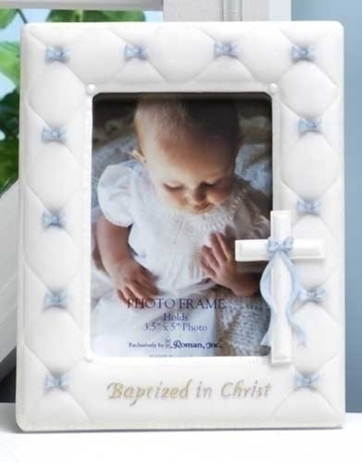 Resin-stone mix frame with blue accents that holds a 3-1/2" x 5" photo under glass. Verse reads: "Baptized in Christ" Boxed. 7
