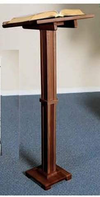 Lectern in solid wood, finished with a Walnut stain. Height 43" with a 15"deep x 16" wide top.