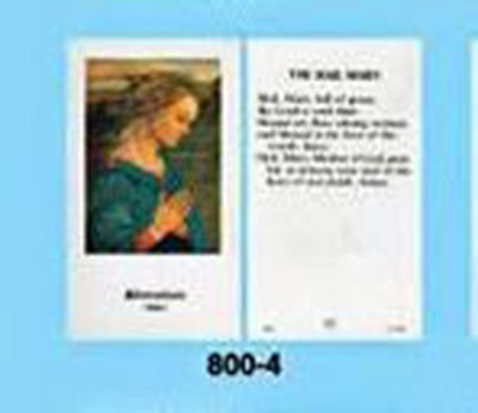 Full color paper holy cards with the Hail Mary prayer on the back. Made in the USA. 100 per box. 2-1/2" x 4-1/4