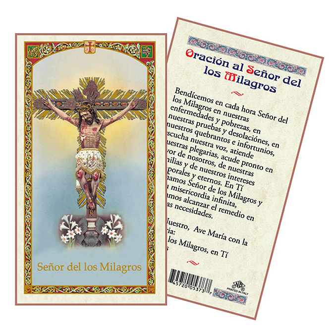 Laminated holy card in full color with a prayer on the back in Spanish. Imported. 2-1/2" x 4-1/2".
