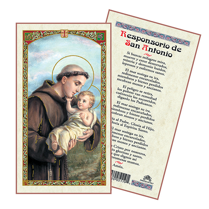Laminated holy card in full color with a prayer on the back in Spanish. Imported. 2-1/2" x 4-1/2".