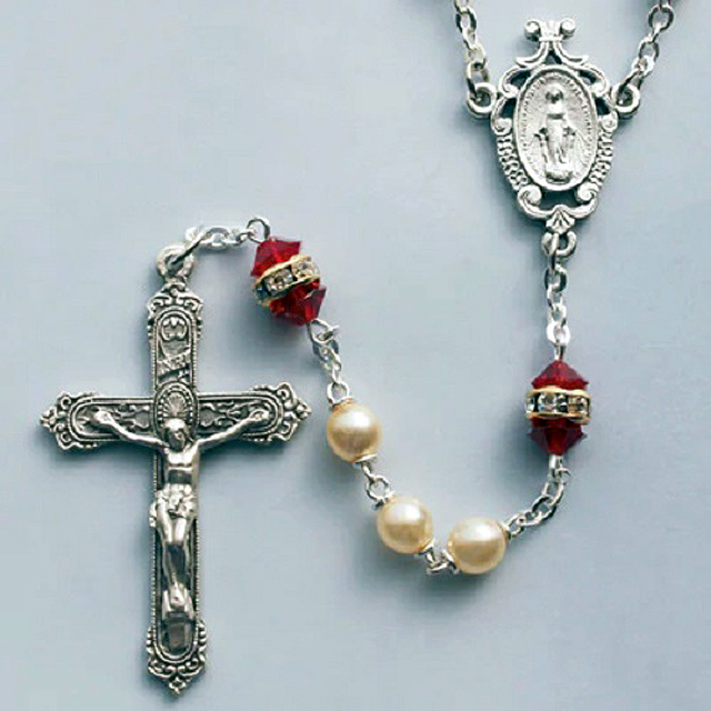 Rosary made from lock link pearls with crystal and ruby rhinestone rondelle Our Father beads. 21" Long.