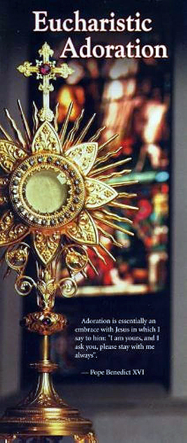 How-to-guide for prayerful and thoughtful devotion, includes illustrated explanation of the objects used in adoration 8 page foldout pamphlet 4" x 9". English.