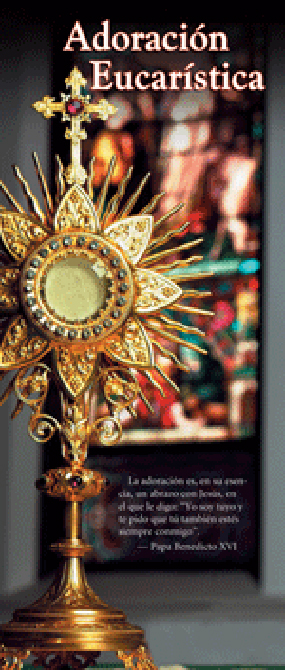 Eucharistic Adoration. A how-to-guide for prayerful and thoughtful devotion, includes illustrated explanation of the objects used in adoration 8 page foldout pamphlet 4" x 9". Spanish.