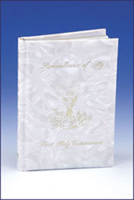 Marian children's mass book, padded simulated pearlized cover, rounded spine, gold stamping and gold edges.