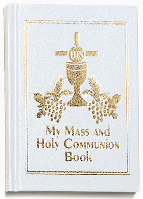 Gold, hot stamped, textured hard cover edition of my mass and holy Communion book.
