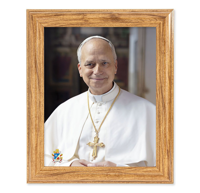 With this formal portrait of Pope Leo XIV, celebrate our new Holy Father with this beautiful framed image. 8 inch x 10 inch print under glass in a light stained walnut frame. Finished size 10" x 12".