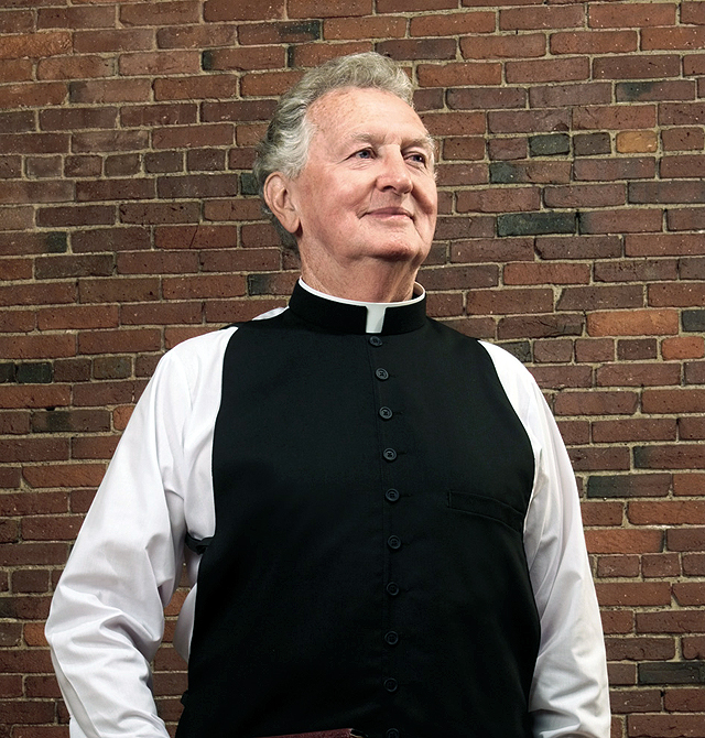 Roman vest front poly-wool, breast pocket with Velcro closure, 21" long, hand washable. White collar sold separately. Specify neck size and your choice of no. #2 (1-1/4") or #3 (1-1/2") heights.