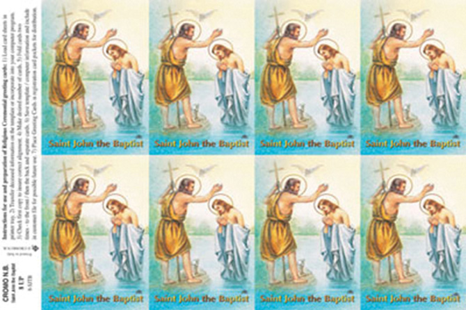 Full color paper holy cards on a sheet with custom imprint of your choice on back.. Micro-perforated to easily detach. Submit by fax or email the message or prayer you want to be printed on the back of the cards. A proof of the exact text will be provided for your approval and signature. 8 cards per sheet. Minimum amount to imprint 3 sheets or 24 holy cards. 8-1/2" x 10", individual card size 2 1/2" x 4 1/4