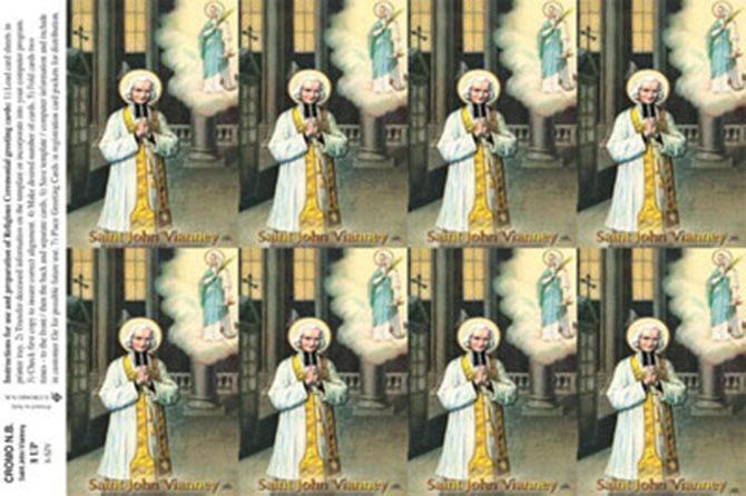 Full color paper holy cards on a sheet with custom imprint of your choice on back.. Micro-perforated to easily detach. Submit by fax or email the message or prayer you want to be printed on the back of the cards. A proof of the exact text will be provided for your approval and signature. 8 cards per sheet. Minimum amount to imprint 3 sheets or 24 holy cards. 8-1/2" x 10", individual card size 2 1/2" x 4 1/4