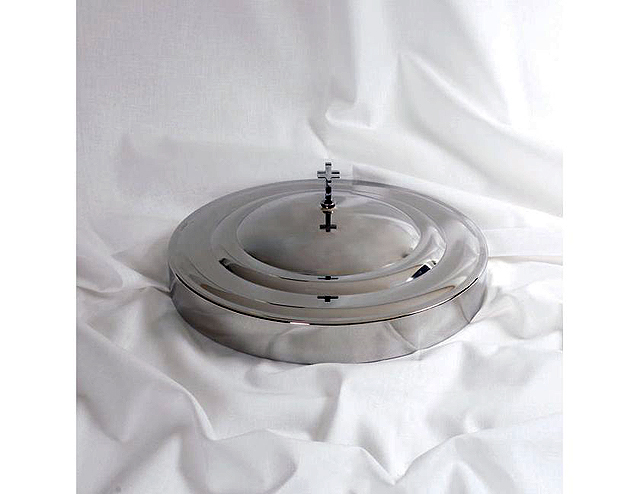 The RemembranceWare: Communion Tray Cover - Silver Finish is made of the same high-end, food grade stainless steel as are all RemembranceWare pieces. It achieves it's beautiful silver shine through a polishing process. The Communion Tray Cover fits snugly with the tray and features a simple, yet elegant, Latin cross finial which is attached with a stainless steel screw and washer. The Communion Tray Cover is standard size (1 3/8" tall sides and has a diameter of 11"). The edges are double rounded to ensure a smooth and safe feel to this piece. RemembranceWare pieces are easily cleaned with mild soap and water and a soft cloth.