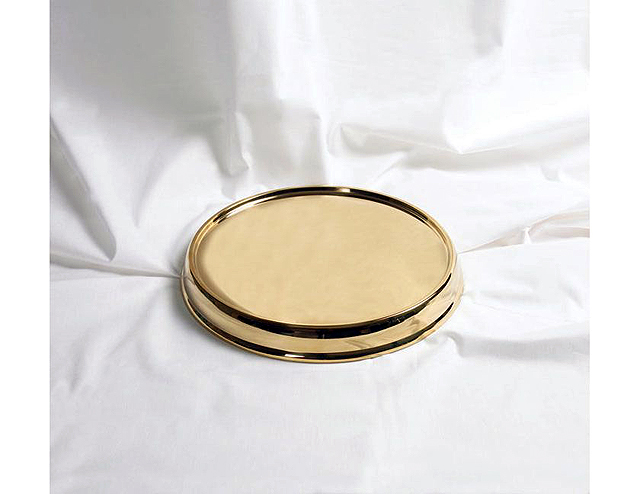 The RemembranceWare: Communion Tray Base - Brass Finish is made of the same high-end, food grade stainless steel as are all RemembranceWare pieces. It achieves it's beautiful brass shine through a polishing process. This is the Communion Tray Base which the CommunionTray and Disk rests upon. It gives support and creates a dramatic foundation for the stacked Communion Trays. Edges are double rounded to ensure a smooth and safe feel to this piece. RemembranceWare pieces are easily cleaned with mild soap and water and a soft cloth.