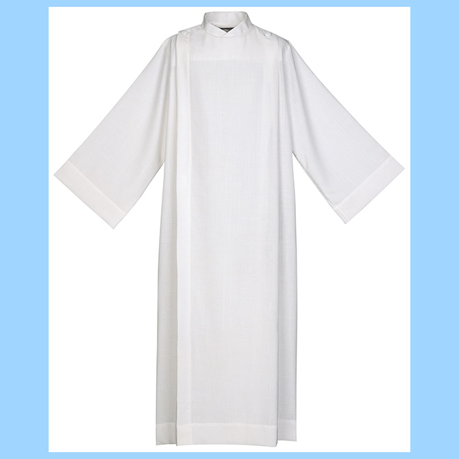 Front wrap alb, 65% polyester and 35% cotton, Herringbone Weave with buttons.