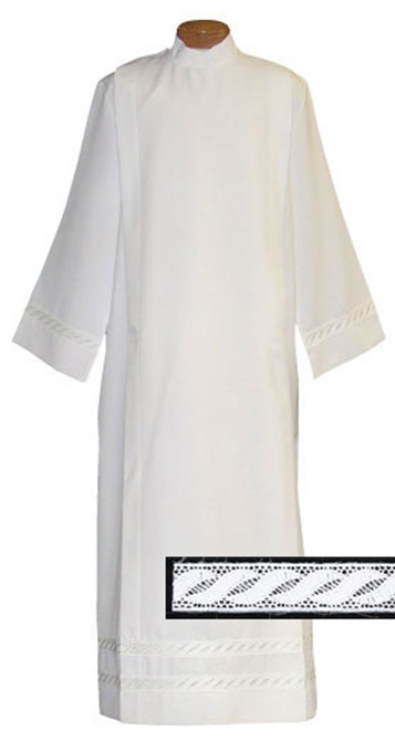White poly/wool blend alb with 1-1/2" bands white embroidered braid. Please specify both size AND button or Velcro closure in the comment area of the order.