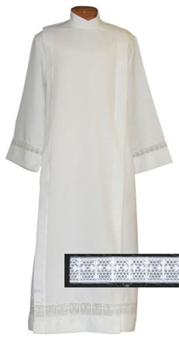 White poly/wool blend alb with 1" lace with Latin crosses on sleeves and 3" lace with Latin crosses on bottom. Please specify both size AND button or Velcro closure in the comment area of the order.