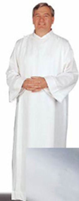 Plain poly/wool blend alb. Please specify both size AND button or Velcro closure in the comment area of the order.