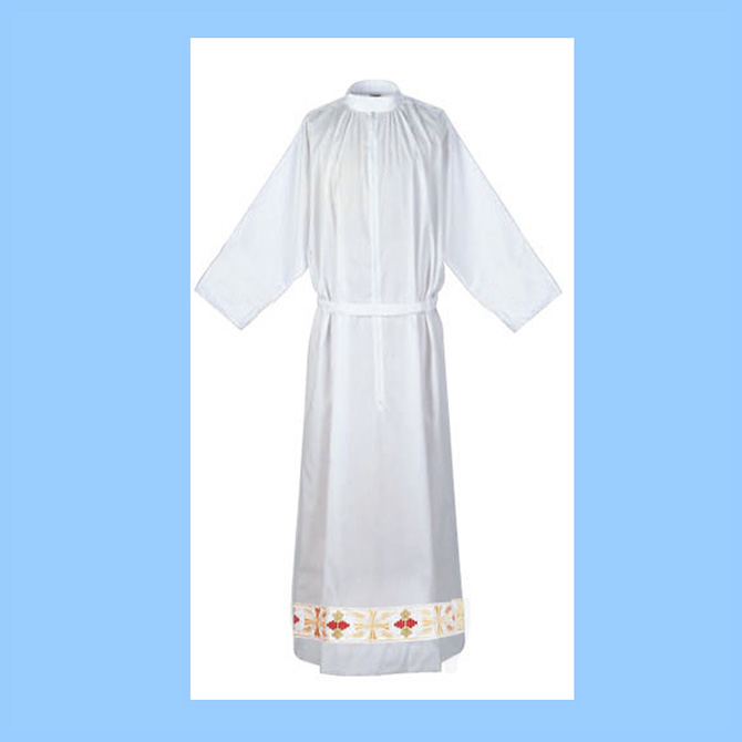 Clergy Fitted Alb with Multi-color banding on the bottom only (not on sleeve). Alb fabric is 65% Polyester and 35% Cotton and features a stand-up collar and adjustable Velcro belt. Banding features wheat and grapes design using colored threads of antique gold, green and red.