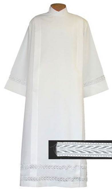 White poly/wool blend alb with 1", non-tarnishing silver embroidered bands. Please specify both size AND button or Velcro closure in the comment area of the order.