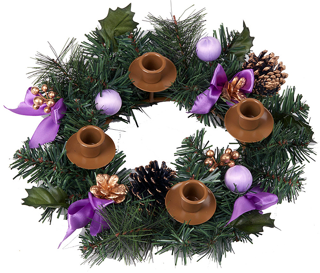 Traditional Pine Code Advent Wreath with subtle mix of greens, pine cones & purple ribbons. Candles sold separately. Diameter 11". Boxed.