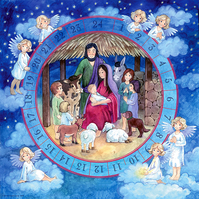 Bible text following the story of the Nativity with corresponding picture Image duplicated on reverse Glitter on calendar 17" x 17"