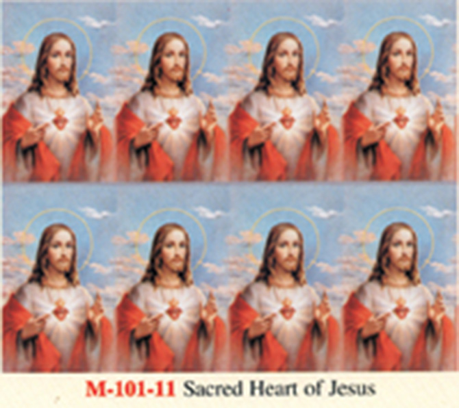 Full color paper holy cards on a sheet with custom imprint of your choice on back.. Micro-perforated to easily detach. Submit by fax or email the message or prayer you want to be printed on the back of the cards. A proof of the exact text will be provided for your approval and signature. 8 cards per sheet. Minimum amount to imprint 3 sheets or 24 holy cards. 8-1/2" x 10", individual card size 2 1/2" x 4 1/4