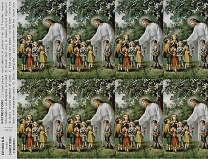 Full color paper holy cards on a sheet with custom imprint of your choice on back.. Micro-perforated to easily detach. Submit by fax or email the message or prayer you want to be printed on the back of the cards. A proof of the exact text will be provided for your approval and signature. 8 cards per sheet. Minimum amount to imprint 3 sheets or 24 holy cards. 8-1/2" x 10", individual card size 2 1/2" x 4 1/4