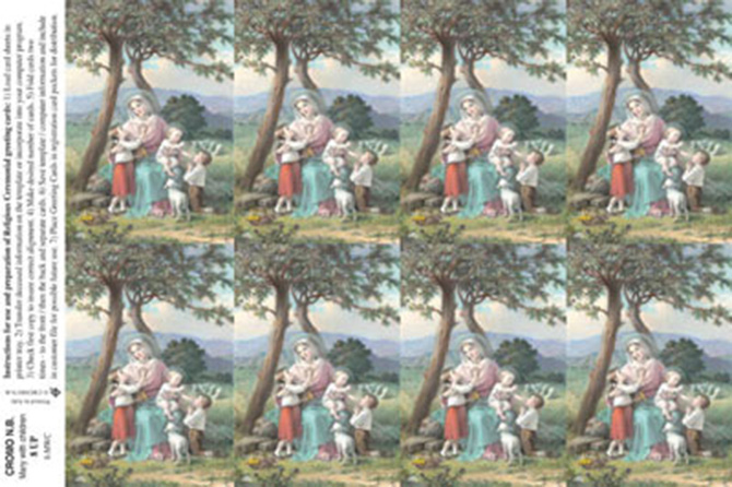 Full color paper holy cards on a sheet with custom imprint of your choice on back.. Micro-perforated to easily detach. Submit by fax or email the message or prayer you want to be printed on the back of the cards. A proof of the exact text will be provided for your approval and signature. 8 cards per sheet. Minimum amount to imprint 3 sheets or 24 holy cards. 8-1/2" x 10", individual card size 2 1/2" x 4 1/4