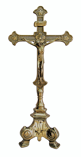 A beautiful heavy Three Point brass base Crucifix finely crafted with attention to detail. The Crucifix is in a shiny brass and is 13-1/4 inch tall. Made in Italy.
