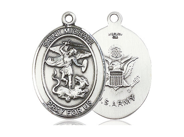Sterling silver medal of St Michael on the front with the Army emblem on the back on a 24" stainless steel chain. Gift boxed.