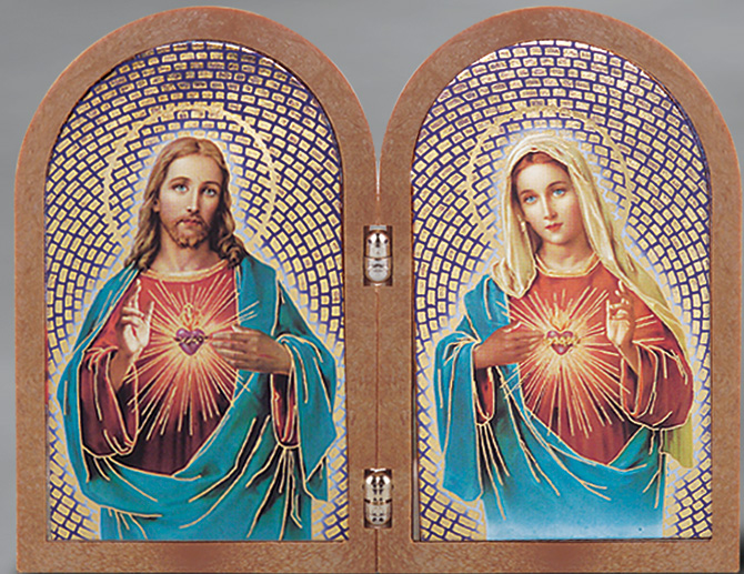 Gold embossed natural wood Sacred Heart of Jesus and Sacred Heart of Mary standing diptych with prayer. Diptych size: 5" x 3 1/2" Made in Hungary. Polybag.