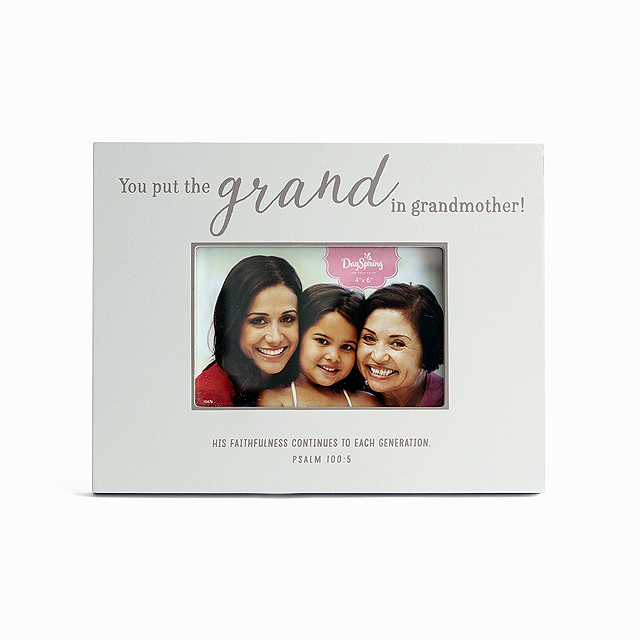 'You put the grand in grandmother!' wooden photo frame is the perfect gift for Mother's Day or just to show your grandmother how much she means to you. Psalm 100:5 is sure to encourage her daily. The neutral tones can easily be used in any room and is a reminder to your grandmother that she is loved. Dimensions: 10 inches wide x 7-13/16 inches high x 0-1/2 inches deep - Holds 6inch x 4 inch photo. Made of wood composite and glass. Easel for desktop, countertop, or tabletop display.